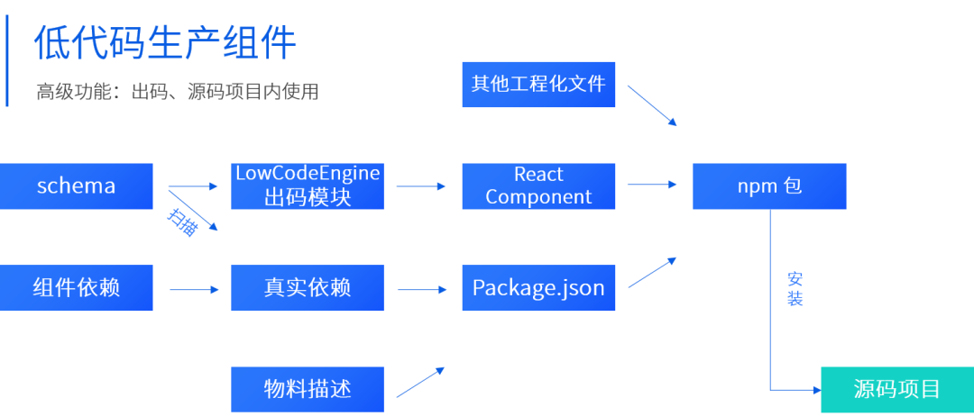 在我们的实践中,使用出码模块对组件的schema进行出码,转换为React代码,同时分析组件的依赖以及物料描述,生成组件所需的package.json,再补充其它的工程文件。组成一个完整的React组件脚手架,再利用这个脚手对组件进行构建发布,最终生成一个npm 包。这个npm包其本质就是一个纯粹的React组件,因此他可以在任何 React 项目中直接使用。低代码平台的建设和应用是一个实践的过程,在这个过程中需要产品、平台和人不断的磨合,其成熟度和健壮性也需要时日加以完善。