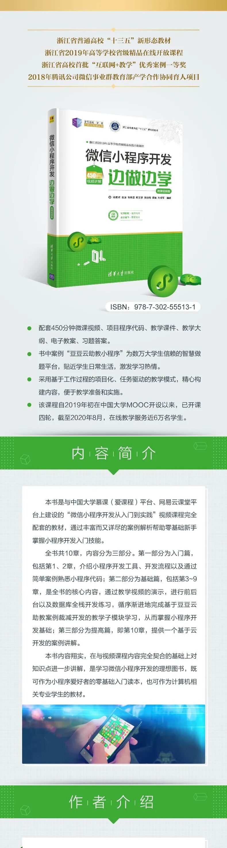 “微信小程序开发”是工科类本科教学中的一门重要实践课,让想从事微信平台、微信小程序开发的同学能更快地掌握开发语言和开发项目的具体实施内容,让每个参与课程的学生都能开发自己想做的内容,以微信小程序的形式展现出来,课程通过丰富的案例教学,让学生轻松依托新浪云建立基于云服务的在线实践平台,培养同学独立开发微信小程序加云平台的在线信息处理能力。