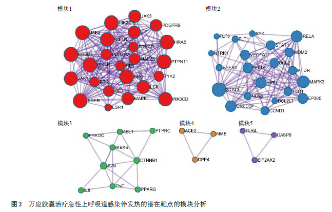 将共同靶点输入STRING 数据平台,对获得的PPI 网络进行拓扑结构分析,Cytoscape 软件网络拓扑参数计算结果显示,中介中心性值排名前10 的基因包括STAT3、PIK3R1、PTPN11、SRC、HRAS、PIK3CA、CINNB1、AKT1、JUN、STAT1,可能是万应胶囊治疗急性上呼吸道感染伴发热的重要潜在药效活性成分,圆圈越大,中介中心性值越大,见图1。2. 3 模块分析