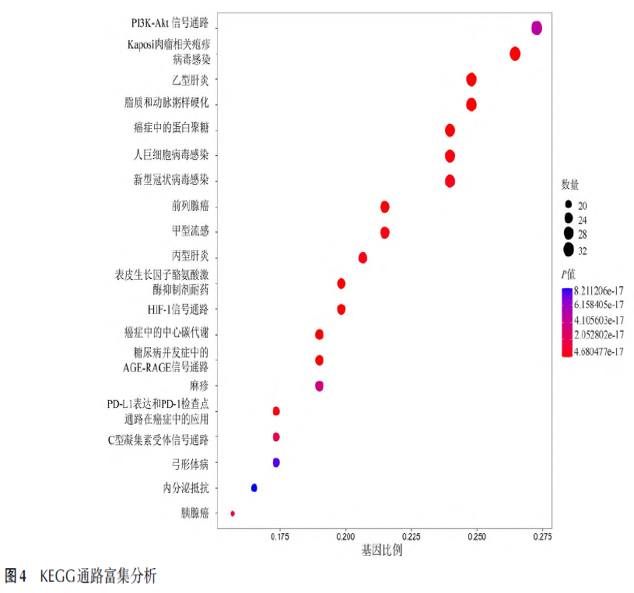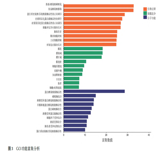 模块分析结果涉及5 个模块的 60 个靶点可能发挥重要的作用。每个模块对应特定的生物学功能。其中,模块1 涉及蛋白酪氨酸激酶的活性,模块2 涉及转录因子结合,模块3涉及DNA结合转录因子结合,模块4涉及肾素-血管紧张素系统,模块5涉及肽酶活性。根据中介中心性与度中心性进行排序,将STAT3、HRAS、SRC、PIK3R1、PTPN11 鉴定为万应胶囊治疗急性上呼吸道感染伴发热的关键靶点,见图2。2. 4GO 功能及KEGG 通路富集分析