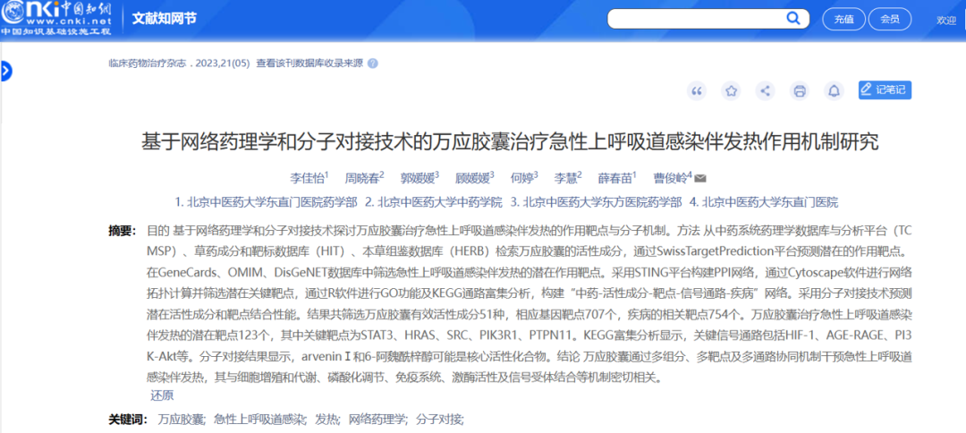 [1] 李佳怡,周晓春,曹俊岭,等. 基于网络药理学和分子对接技术的万应胶囊治疗急性上呼吸道感染伴发热作用机制研究[J]. 临床药物治疗杂志,2023,21(5):63-69.