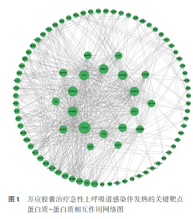 在GeneCards 数据库[11]、OMIM 数据库及Dis⁃GeNET 疾病数据库[12]中以“acute upper respiratoryinfection accompanied with fever”为关键词筛选与其相关的疾病靶点,删除重复和无效基因名称后,获得疾病靶点。1. 4 构建蛋白质-蛋白质相互作用网络图