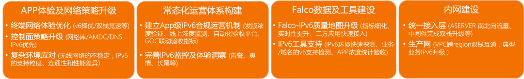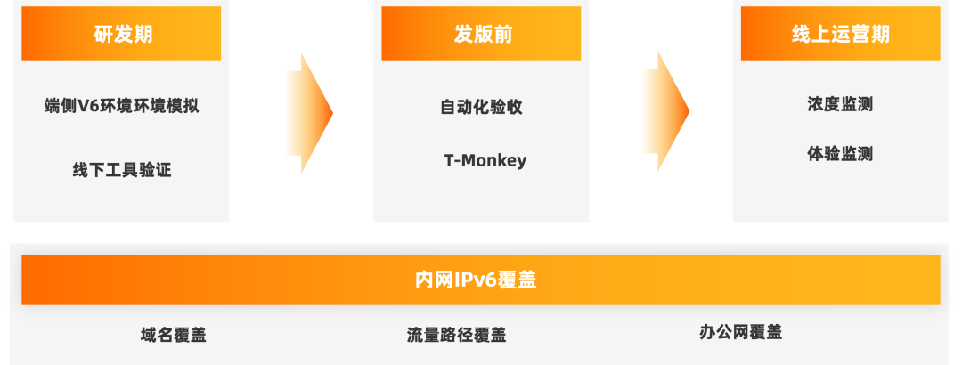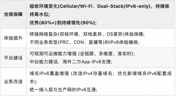 实现来常态化IPv6运营支撑,面向IPv6高浓度水位及优秀体验保障,确保IPv6高浓度不回退、用户体验不劣化,通过研发流程来避免日常业务迭代与IPv6正交带来的合规风险与体验损伤。