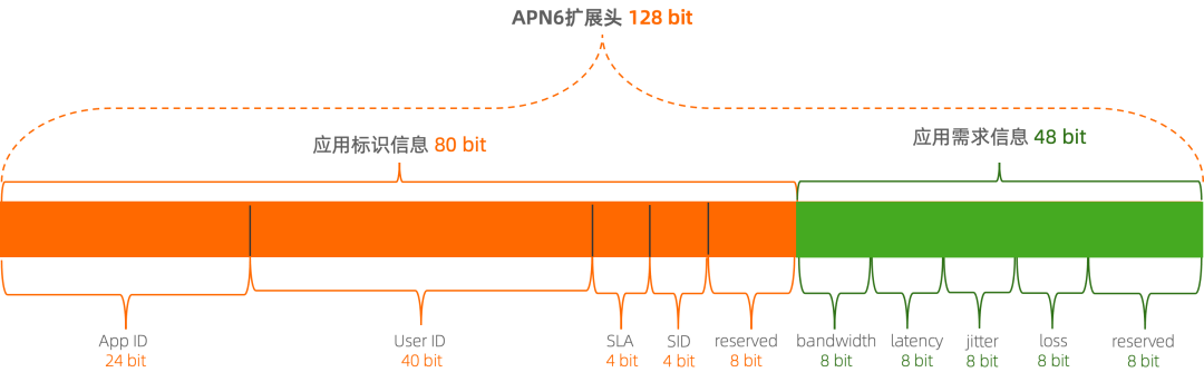 ▐基于APN6的可确定性网络什么是 APN6互联网应用对网络带宽、时延、抖动、分组丢失率等方面的需求各不相同,而网络和应用的解耦导致网络无法有效感知应用的需求,因此难以为应用提供相应的服务质量SLA保障。基于IPv6的应用感知网络框架--APN6,全称Application-aware IPv6 networking,通过将应用的需求信息封装在数据分组中,使网络能感知应用及其需求,便于网络进行流量调度和资源调整。具体类容即是传统IP(IPv4)报头仅包含源地址与目的地址,网络无法识别该IP包承载的业务类型与服务等级要求。APN6利用IPv6可扩展报头 128 个比特的前 80 个比特来标注用户的身份、App 的身份 以及服务质量的等级要求,用后 40 个比特来定义 IP 流承载的业务对信道的带宽、 抖动、时延、丢包率的要求。网络根据 IPv6 地址即可识别 IP 流对信道的 QoS 要求。图10: APN6 扩展头