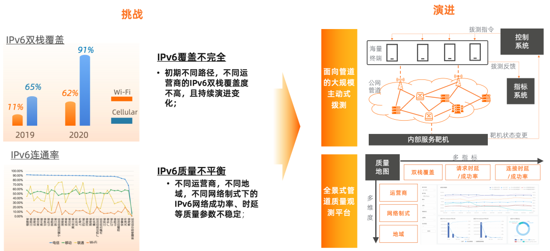 《行动计划》要求,用5到10年时间,形成下一代互联网自主技术体系和产业生态,建成全球最大规模的IPv6商业应用网络,实现下一代互联网在经济社会各领域深度融合应用,成为全球下一代互联网发展的重要主导力量。作为应用,我们与运营商在IPv6推进上面临“鸡生蛋还是蛋生鸡”的老问题,但作为国内头部互联网公司,联合生态参与者直面问题并推动行业生态演进即是政策要求,也是我们的内在担当。我们从应用视角出发,IPv6 部署初期,基础网络发展不平衡是必经之路,不同路径、不同运营商的 IPv6 双栈覆盖度不同,且持续演进变化。另外,不同运营商、不同地域、不同网络制式下的网络成功率、时延等质量参数参差且不稳定。为了保障用户体验,首先要解决管道质量的可测量、可观测,这是应用层实现高可靠的基础。针对以上问题,我们实现了面向管道的大规模主动拨测。