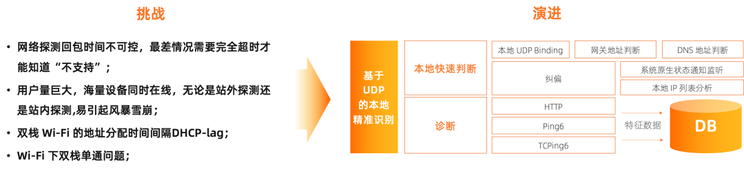 苹果于2016年5月4日正式发布声明:自2016年6月1日开始,App Store策略要求所有iOS应该必需包含对 IPv6-only 网络的的支持,所有提交至苹果App Store的应用申请必须要兼容面IPv6-only网络。该问题核心是要解决如何在端上判断 IPv6 是单栈还是双栈支持。发包探测会对用户体验 带来极大影响,因此必须实现本地快速判断,我们通过本地 UDP Binding 的方式实 现了判断。但本地 UDP Binding 的判断存在误差,需要解决纠偏问题。我们通过系统原生状态通知、网关地址判断以及 DNS 地址判断实现了本地快速判断。同时经过线上多年实践沉淀,至今年双十一前,针对Wi-Fi下双栈地址分配的DHCP-lag 及 双栈单通问题也通过完善多维诊断能力来逐步解决。