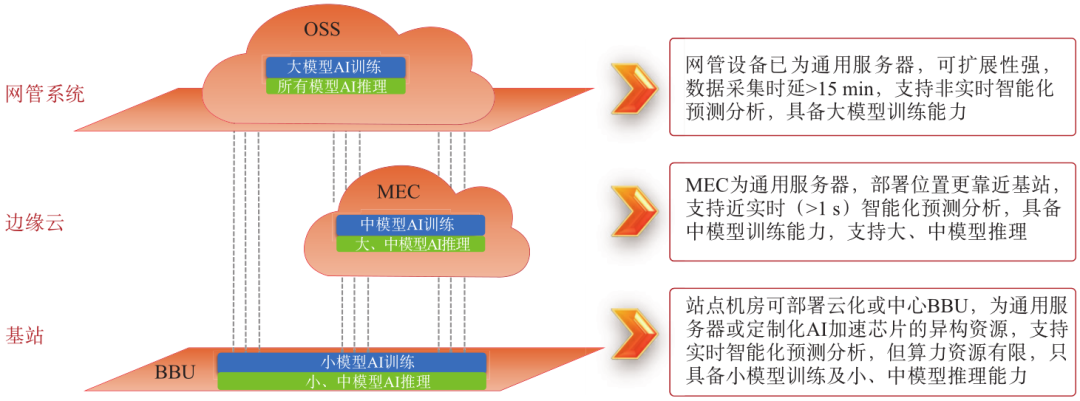 图1 通感智算一体化无线网络架构图[2]2.2 通感智算一体化的关键技术2.2.1 通感融合技术因通信与感知具备类似的网络架构和频段,通感融合能够将通信、感知、算力等因素基因化再进行智能基因重组,实现智能化、融合化、低碳化、高效能化的全新无线架构,通感一体化无线网络也是未来网络发展的必要目标。通感融合不仅要考虑通信的指标,还要考虑感知的指标。因此在6G通感融合中,需要打造基因工程,打通通信与感知的关键指标、判别标准和关键技术,并以AI、机器学习等智能化技术进行多维基因片段的高效重组和结合。通感一体化研究是一个循序渐进的过程,需从架构、关键技术和评价指标等方面进行研究,可以有效提升通信质量,也可以实现无接触感知,是未来较有潜力的发展场景。通感融合将面临来自场景需求、政策和技术等多方面影响,但是其对资源的深度集成化,极大地节省了部署成本,为未来的通感融合技术构建了一个开放互助、良性发展的全行业生态圈[3-7]。通感融合研究可分为5G-A阶段和6G阶段,这两个阶段的通感智算一体化架构将有较大的差异性。5G-A阶段主要考虑与现有5G网络的协调性,与网络架构的向下兼容性。6G阶段主要考虑新技术、新业务的融入,新架构的开发以及原有架构的深度调整。以下对面向通感发展的业务和功能进行详细介绍。5G-A阶段主要考虑使用5G服务感知的阶段。该阶段主要使用复用5G架构和低粒度的修订网元实现感知的功能,并不会过度要求感知对通信的优化。在此阶段,通信、感知、算力和智能化的关系可以简单归纳为:通信辅助感知,实现一机多用;算力作为感知处理的基础,高效协同感知处理资源;智能化作为融合的初步引擎,实现高精度感知。6G阶段在考虑高精度感知的情况下,还需考虑如何使用感知提升通信性能。此阶段将是通信、感知、智能和算力强力融合的阶段,业务的耦合化和技术的深度内生加持将成为通感融合的特色。通信、感知、算力、智能化的关系可以归纳为:精细化感知辅助高效能通信,实现无线资源的合理调度;算力作为通信和感知协同的底座,实现分布式、高效化、低时延的通感融合网络;智能化作为内生网络的大脑,实现高质量通信与感知。2.2.2 智能化技术AI为5G和6G无线网络的运行提供了众多潜在功能,是无线网络发展的加速器。基于图1的架构来看,目前,无线网络智能化主要在网管侧应用域实现,如智能节能、故障根因分析等;控制域的意图解析等还在探索阶段;资源域的高层AI(如智能编排等)已进行部分商用部署;物理层AI、智能超表面等受算力及效果的限制,尚处于探索阶段。下面从技术演进及模型分级部署两方面介绍网络智能化演进情况。(1)网络智能化技术演进特征随着无线网络的演进,智能化的发展将从AI4NET(AI for Network)到NET4AI(Network for AI)的阶段转变,要求移动通信网络不仅是传输管道,更要将智能服务所需的多维资源与网络功能、协议和流程进行深度融合设计。到6G阶段,无线网络将向智能内生方向演进,在网络架构内部提供数据采集、数据预处理、模型训练、模型推理等AI工作流全生命周期的运行和管理,将AI服务所需的算力、数据、算法、连接与网络功能、协议和流程进行深度融合设计,支持将AI能力按需编排,为高水平网络自治和多样化业务需求提供智能化所需的基础能力[8]。6G无线网络将向云化与分布式的方向发展,需要考虑分布式网元节点间多维异构资源的协调性以及智能服务对性能的差异化需求。6G网络中智能服务的质量,需要综合考虑智能服务对通信、计算、数据和存储资源的不同需求[9]。(2)网络智能化模型分级部署从网络智能化实现及部署的角度来看,现阶段可将AI简单分为模型训练和模型推理功能。根据所处位置和算力能力的不同,AI适用于不同的应用案例和场景。目前,5G基站侧只支持小模型的推理,随着基站算力的增强、基站云化技术的应用,到6G阶段,基站将支持智能内生,可进行小规模AI训练和AI推理,其它大、中模型根据场景需求可分别部署在移动边缘计算(Mobile Edge Computing,MEC)或OSS中。如图2所示,在网管应用域,网管设备为通用服务器,可扩展性强,数据采集时延大于15 min,支持非实时智能化预测分析,具备大模型训练能力;在边缘云资源域层面,MEC为通用服务器,部署位置更靠近基站,支持近实时(>1 s)智能化预测分析,具备中模型训练能力,支持大、中模型推理。