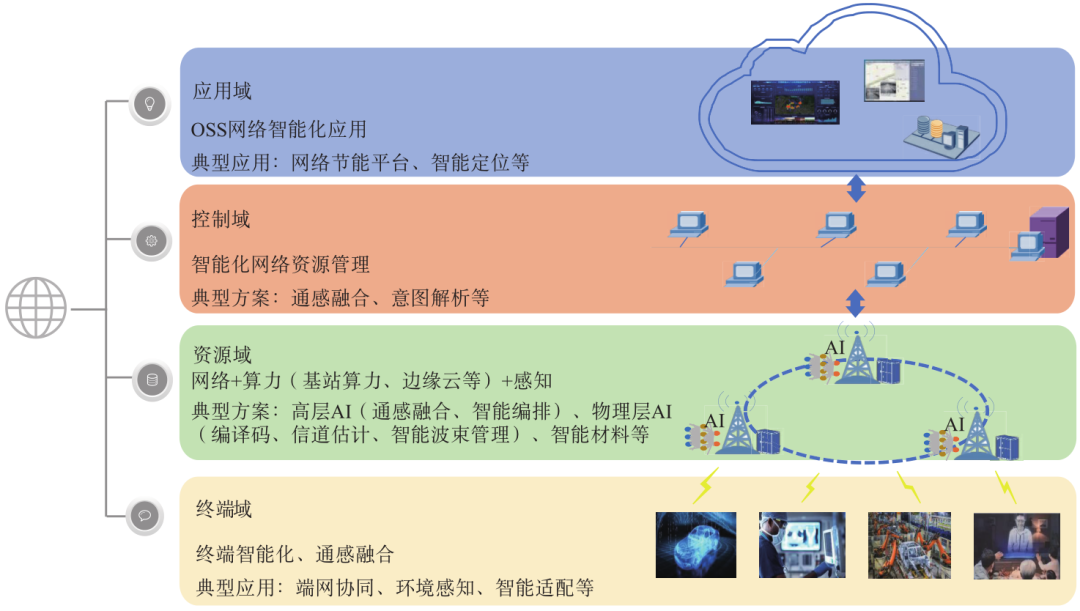 0 引言人工智能(Artificial Intelligence,AI)、大数据等信息技术的发展在各行业领域催生出丰富的新场景、新用例,感知、计算、智能将是5G增强(5G-Advance,5G-A)甚至6G新系统的重要技术组成,可实现运营、数据、信息和通信技术(Operation,Data,Information and Communication Technology,ODICT)融合。IMT-2020(5G)明确了5G-A的六大应用场景,即沉浸实时、智能上行、工业互联、通感一体、千亿物联、天地一体;国际电信联盟(International Telecommunication Union,ITU)在IMT-2020三大场景(即增强型移动宽带、超高可靠低时延通信、海量物联网通信)基础上进行深化,将增强型移动宽带扩展为沉浸式通信,同时拓展了泛在连接、人工智能与通信融合、感知与通信融合三大新型场景,最终形成6G六大应用场景,即沉浸式通信、极高可靠低时延通信、超大规模连接、泛在连接、人工智能与通信融合、感知与通信融合[1]。新型6G场景下的众多业务应用具有密集型计算、极致性能的特征,当前网络无法在高效保障用户体验的情况下为网络自身和终端按需提供计算服务,此外,算力将成为6G内生智能、感知等计算型服务的基础平台能力。因此,网络架构向通感智算一体化方向演进是面向6G发展的必然趋势。1 通感智算一体化网络演进挑战传统无线网络专注于连接和管理,6G通感智算一体化无线网络需要增加感知、智能、算力、数据处理、安全增强等能力,如何将这些能力与现有网络结合极具挑战性。同时,6G通感智算一体化无线网络也要适应未来业务场景的多样化、ODICT技术的融合、商业的极致性能、持续发展的社会责任等需求。因此,6G通感智算一体化无线网络的复杂程度进一步增加,其演进也面临巨大挑战。在通感方面,实现6G通感智算一体化无线网络需要融合通信和感知两种典型功能,因此需要充分考虑核心网、空口等网元或者资源在感知和通信资源的业务化均衡。在空口方面,比较典型的是如何采用合适的波形、帧结构或者多入多出(Multiple-Input Multiple-Output,MIMO)技术实现感知功能,尤其是在感知精度要求较高的情况下,如何提升感知精度;在网元和架构设置方面,需要综合考虑通信和感知需要的时延、业务处理能力等,进行架构的合理化设置。在智能化方面,实现6G通感智算一体化无线网络面临数据采集、处理、存储的挑战,数据使用安全方面的挑战,模型训练算力资源不足的挑战,以及模型使用泛化性、稳定性的挑战等。此外,不同行业和场景中的智能服务对网络的需求千差万别,模型评估及智能化服务质量指标尚无成熟的量化评估方式,如何评估智能化服务质量也是一个重要挑战。在算力方面,实现6G通感智算一体化无线网络存在算力部署、感知、调度、编排、安全等问题,未来6G网络对算力需求巨大,多维算力资源广泛分布在大量的异构网元节点中,在各个网元节点可能都有算力部署。因此,如何高效利用算力资源以及分布式算力协同将是未来需要解决的问题。2 通感智算一体化无线网络架构及关键技术2.1 通感智算一体化无线网络架构6G网络将实现全域融合和极致连接,通感智算一体化无线网络架构将是实现6G网络能力的基础。6G通感智算一体化无线网络可划分为应用域、控制域、资源域、终端域四个层面,可通过在各层面引入感知、智能、算力能力,构建面向通感智算一体化无线网络的全域智能架构。如图1所示,应用域主要指操作支撑系统(Operation Support System,OSS)网管侧的网络智能化应用,典型应用包括网络智能节能、智能定位、智能根因分析等;控制域主要从智能化网络资源管理出发,包括通感融合的控制层面、意图解析等方面的技术及方案;资源域包括网络感知、基站算力及边缘云等,可实现高层AI(通感融合、智能编排)、物理层AI(编译码、信道估计、智能波束管理)、智能材料(智能超表面)等;终端域主要从无线网络和终端协同的角度出发,支持终端智能化、通感融合的实现,典型应用包括端网协同、环境感知、智能适配等。