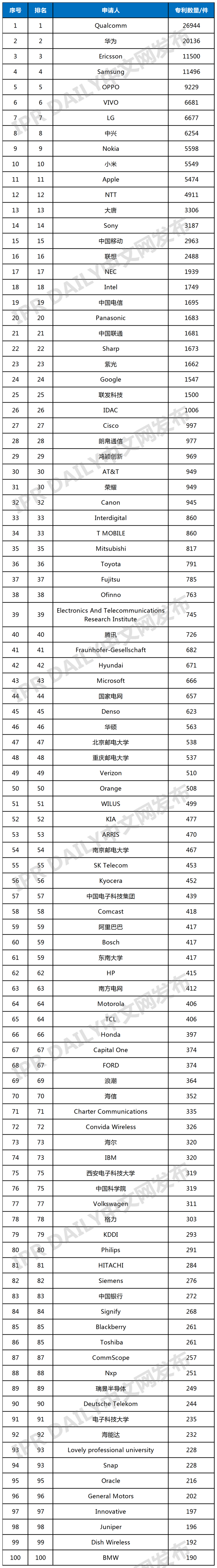 全球无线通信网络技术发明专利排行榜(TOP100)