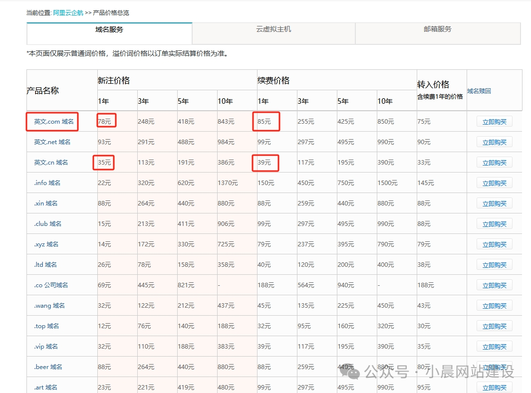 域名国内一半是.com .cn 这种,下面我们看价格表。