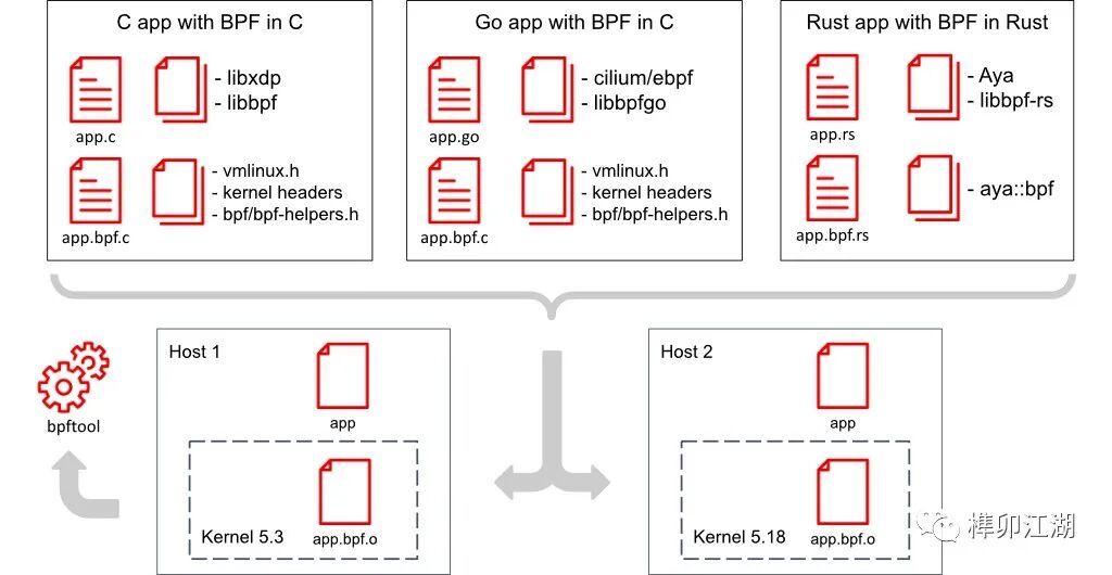 用户空间程序使用 C[16],内核空间 BPF 程序使用 C用户空间程序使用 Golang[17],内核空间 BPF 程序使用 C用户空间程序使用Rust[18],内核空间 BPF 程序使用 Rust这些应用程序开发栈如图 3 所示。