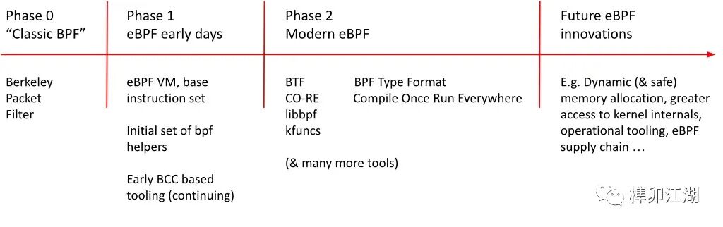 BPF 已经从早期作为 Linux 内核的数据包过滤引擎(图 2)的时代走来了很长的路。在过去的十年中,eBPF VM 已经成为一种通用执行引擎,由Clang[3]工具链支持,具有许多不同用途的程序类型和辅助函数。最近,重点放在了开发者和操作用户体验上,由 BTF、CO-RE 和 libbpf 支持。