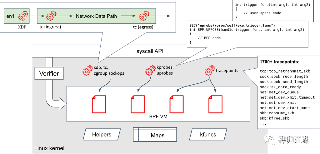 这项技术使用户能够在内核中运行提供的程序,以扩展内核的功能。验证程序在加载到内核之前会检查 BPF 程序,以确保它们不会危及内核的可靠性。这些程序会被 JIT(Just-In-Time)编译成本机指令,因此它们足够高效,可以在性能要求最高的情况下执行,例如网络数据包处理。
