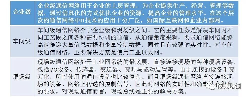 一般而言,企业的通信网络可划分为3级,及企业级、车间级和现场级。